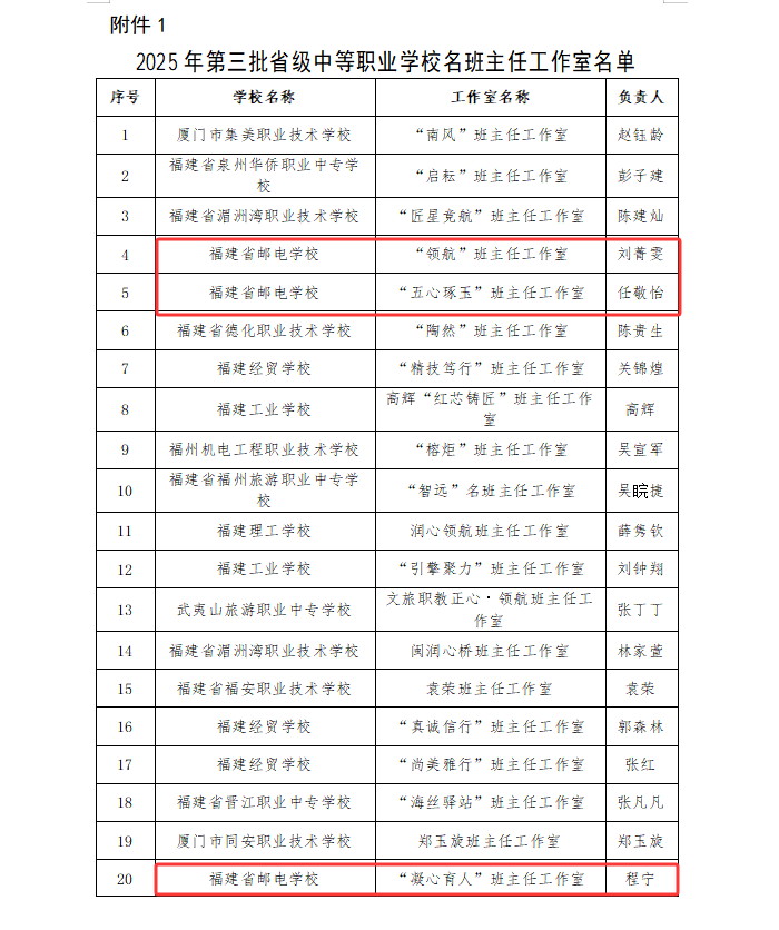 近日,福建省教育厅公布了第三批省级中等职业学校名班主任工作室名单,我校遴选推荐的三个班主任工作室全部成功入选,特此报喜!
