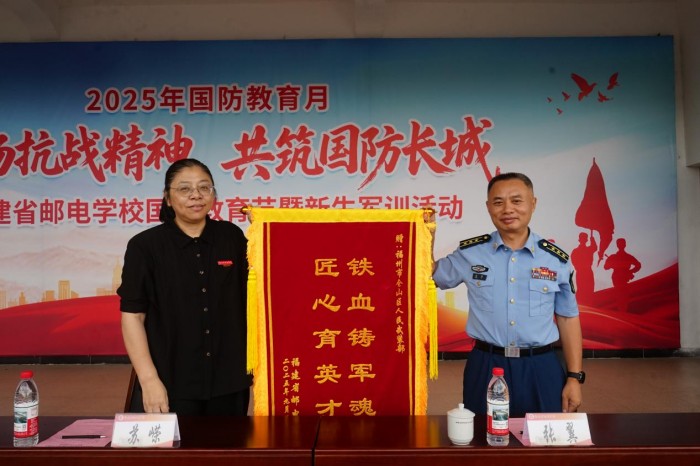 校党委副书记、校长苏嵘向仓山区人武部赠送锦旗,表达对仓山区人武部及承训教官衷心的感谢和诚挚的敬意。