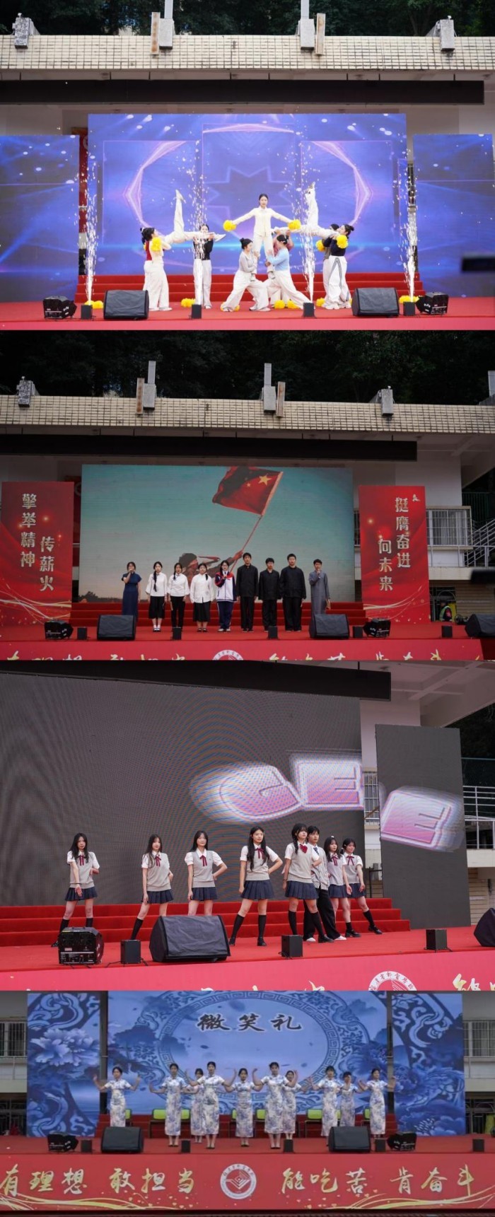 文艺表演环节精彩纷呈、高潮迭起。龙鼓社团舞龙表演《龙行万里》气势磅礴,展现中华传统文化的鲜活生命力;经典诵读专场中,《我喜欢出发》《豆角鼓》等获奖作品轮番登场,用深情演绎传递文字力量与红色情怀;各教学部精心编排的节目各具特色,通信技术专业教学部的舞台剧《永远的格桑梅朵》感人至深,计算机专业教学部的歌曲《计算机乐园》充满创意,经济管理专业教学部的情景剧《财经商贸专业奇遇记》生动鲜活,彰显协同育人成效。校国旗队的《有我在——三军护旗·誓言山河》展现热血担当,啦啦操《青春主打歌》、舞台剧《烽火弦歌》、礼仪操《青花韵·旗袍礼》等节目轮番亮相,涵盖舞蹈、歌唱、乐器演奏等多种形式,全面展现学子青春风采与学校美育成果。