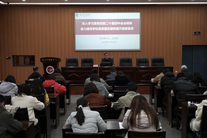 1月23日,我校在学术报告厅举办党的二十届四中全会精神宣讲会,校党委书记包晓晖以“深入学习贯彻党的二十届四中全会精神 奋力谱写学校高质量发展转型升级新篇章”为题面向全体中层干部、青年储备干部和党员作党的二十届四中全会精神宣讲报告。