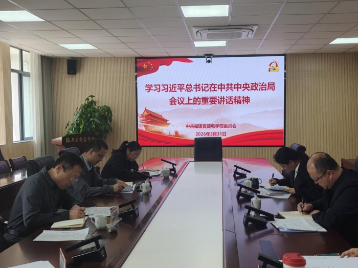 3月31日,福建省邮电学校召开党委会,组织“第一议题”学习习近平总书记在二〇二六年春节团拜会上的重要讲话精神、习近平总书记在中共中央政治局会议上的重要讲话精神、习近平总书记对国家自然科学基金委员会工作作出的重要指示精神、习近平总书记在看望参加政协会议的农工党九三学社医药卫生界社会福利和社会保障界委员时的重要讲话精神和习近平总书记重要文章《让愿担当、敢担当、善担当蔚然成风》。校党委书记包晓晖主持会议并讲话。