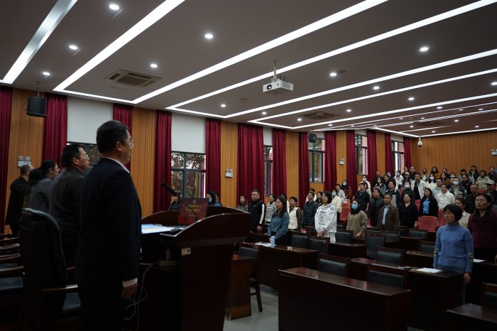 教代会在庄严的国歌声中拉开帷幕,全体教代会代表肃立齐唱国歌。