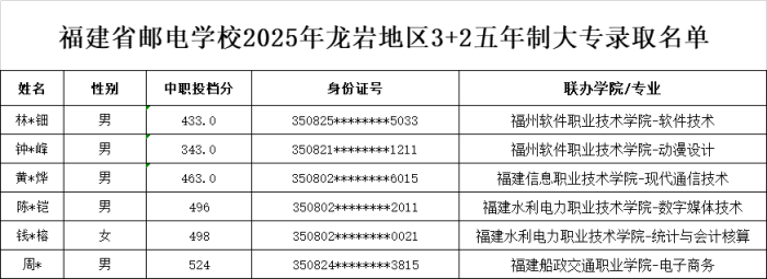 您现在的位置: 首页 > 学校信息 > 通知公告通知公告 福建省邮电学校2025年龙岩地区3+2五年制大专录取名单 发布时间:2025-07-31 //echo ;?> 来源:招生办公室点击: 招生热线:0591-83573573 学校地址:福州市仓山区上渡路李厝山60号 上一篇:福建省邮电学校2025年三明地区3+2五年制大专录取名单 下一篇:福建省邮电学校2025年宁德地区3+2五年制大专录取名单