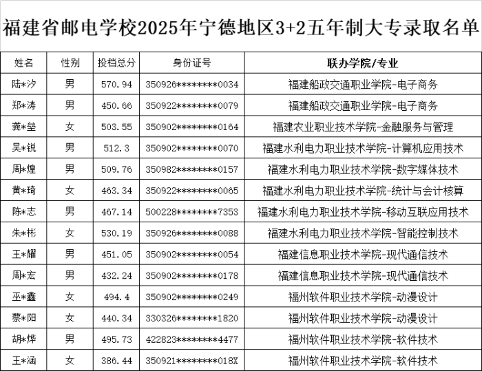 福建省邮电学校2025年宁德地区3+2五年制大专录取名单