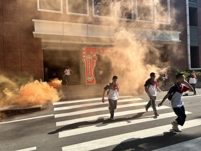 下午15时40分,应急警报响起,演练正式启动。各楼层学生在各点位老师的指引下,迅速做好个人防护,弯腰低姿,用衣襟捂住口鼻,按规定疏散路线快速、有序地撤离至操场指定安全区域。随后,各班及时清点人数并向现场指挥报告,整个过程无人员遗漏,行动高效、秩序井然,充分体现出师生较强的组织纪律性和紧急避险能力。