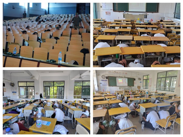 模拟地震警报响起后,在礼堂和教室内的同学们迅速采取防护动作,就近躲避于桌下或墙角,以低姿态蜷身,有效规避坠物危险。