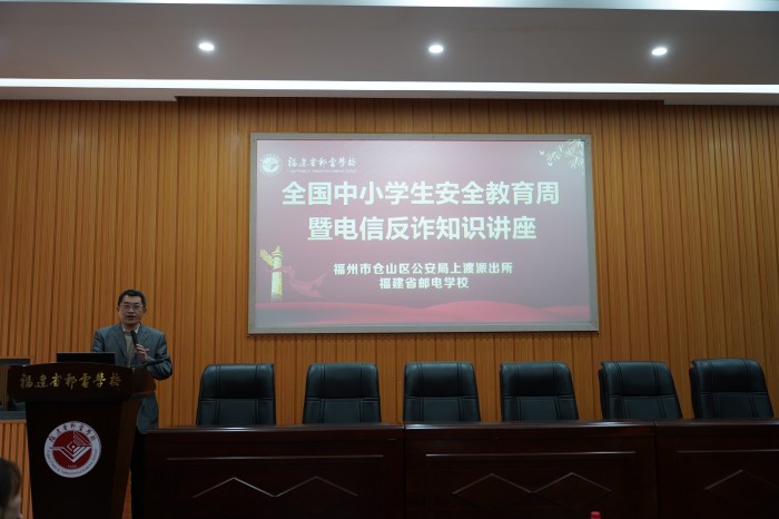 2026年3月30日是第31个全国中小学生安全教育日。当日下午,我校学生与保卫科联合上渡派出所、仓山移动分公司在学术报告厅举办安全教育日主题活动暨反诈知识讲座。上渡派出所李华警官、仓山移动分公司综合办公室主任陈琼担任主讲,我校党委委员、副校长林鹏出席,学生与保卫科人员、班主任代表及学生干部近200人参加。