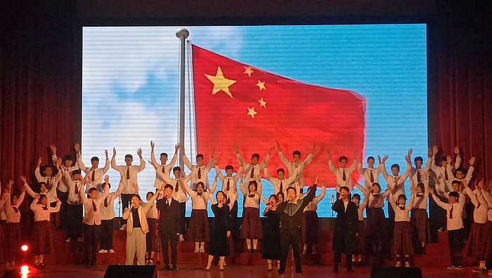 黄晶乐、苏宸、林日辉、侯炎辉四位老师与2020新生班助合唱团联唱《少年中国说》、《红旗飘飘》