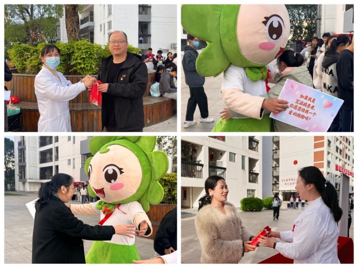 11月28日下午,校医务室在学生公寓广场上举行2025年世界艾滋病日主题活动暨体验式生命教育活动,通过发放防艾宣传册、佩戴红丝带徽章、现场义诊咨询、向教职工发放计生用品等活动向师生们普及防艾知识,还设置了“艾”的大富翁、“艾”不迷路等活动环节,将艾滋病相关知识与游戏结合在一起,寓教于乐,师生们踊跃报名。苏嵘校长、林则烽副校长及总务科党支部也加入到活动中来。此次还请到了福州市防艾吉祥物“福小艾”,手举“如果我是艾滋病患者,你愿意给我一个爱的抱抱吗”手牌,现场师生纷纷上前与之拥抱,气氛热烈。
