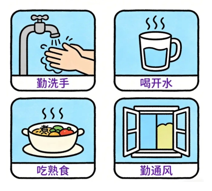 · 勤洗手:饭前便后、接触公共物品后务必用肥皂和流动水洗手。