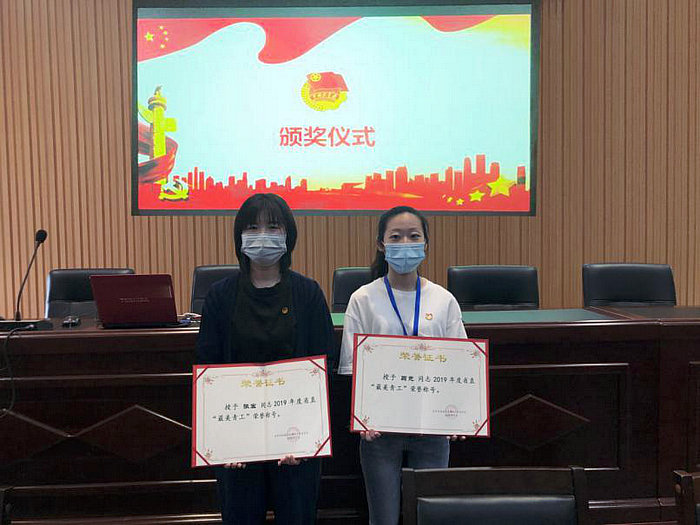 受校党委委员、副校长苏嵘的委托,校团委书记李沛然为翁竞、张宏两位青年教师颁发了“2019年度省直最美青工”荣誉证书。