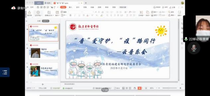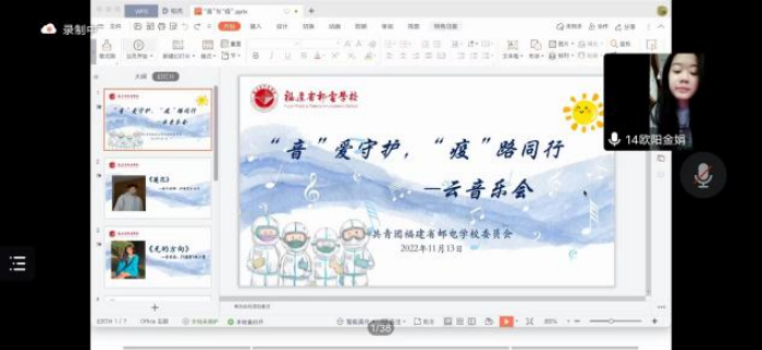 为丰富学生疫情下的课余生活,缓解网课焦虑,增强战‘疫’信心,11月13日下午,校团委组织学生会、各社团、音乐爱好者,开展“‘音’爱守护,‘疫’路同行”云上音乐会。校团委副书记翁竞、团委委员方圆两位老师参与线上活动。