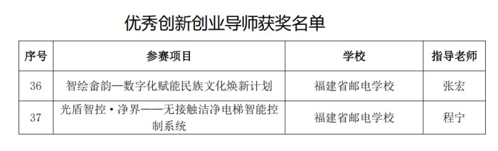 我校《智绘畲韵—数字化赋能民族文化焕新计划》《光盾智控·净界——无接触洁净电梯智能控制系统》2个参赛项目荣获金奖,《寻韵创染——创新非遗蓝染数字化发展的践行者》参赛项目荣获铜奖。两个金奖项目的指导老师张宏、程宁荣获“优秀创新创业导师”称号。