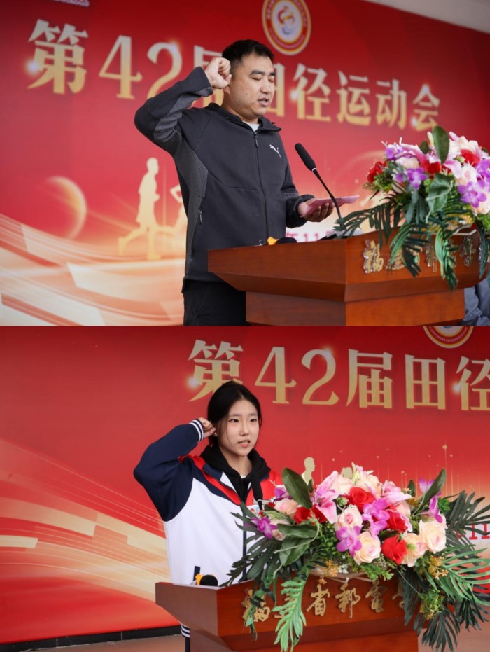 随后,运动员代表24电商班马诗雨同学与裁判员代表唐祖耀老师分别宣誓,承诺将以拼搏姿态全力以赴、以公平公正坚守赛场准则。