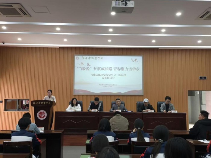 2026年3月30日,我校在学术报告厅、第二阶梯教室召开学生会二级管理改革推进会。校党委委员、副校长林鹏,学生与保卫科科长阮彬及各教学部主任、团总支负责人,校团委干事与全体学生会干部、成员300余人参会,会议由校团委书记翁竞主持。