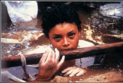 火山爆发后的第三天,美联社的法籍摄影记者富兰克福尼尔赶到现场采访。在现场发现一个叫奥马伊拉的12岁小姑娘被两座房脊卡在中间不能自拔,她的脊椎已被砸伤,尽管福尼尔曾经当过外科医生,但此时也无能为力。只有在他拍下小姑娘那美丽而坚强的面孔的同时,不时同她交谈。希望增强她生存的力量和信心。