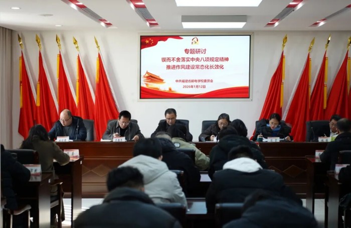 1月12日,福建省邮电学校在党建会议室召开2026年第1次党委理论学习中心组(扩大)学习会。全体校领导、中层干部、各党支部书记、青年教师理论学习小组成员代表、各教学部团总支负责人参加会议。