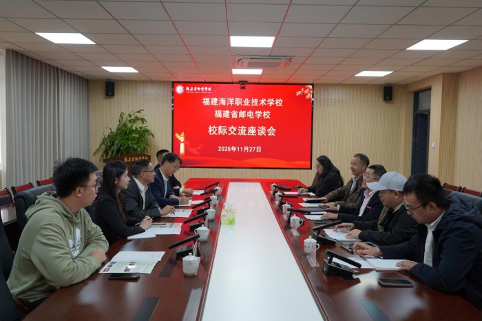 11月27日下午,福建海洋职业技术学校副校长林富凛一行5人莅临我校交流座谈。我校党委委员、副校长林鹏率相关科室负责人参会。