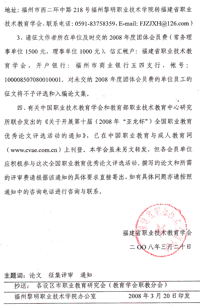 您现在的位置: 首页 > 学校信息 > 教务通知教务通知 福建省职业技术教育学会《论文征集和评审通知》 发布时间:2008-04-21 //echo ;?> 来源:点击: 上一篇:重申05级毕业生实习鉴定表及实习报告上交的通知 下一篇:07/08学年第二学期重修考试安排