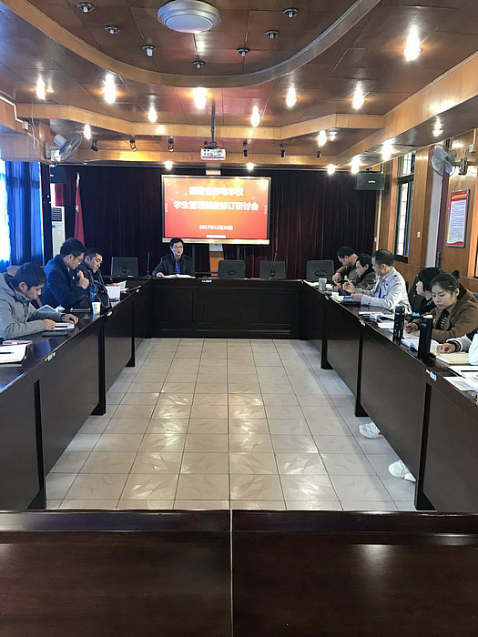 12月26日下午,我校学生与保卫科组织部门相关负责人及部分班主任代表在第三会议室召开学生管理制度修订研讨会。会议由张仁美副科长主持,徐锡光副校长参加并讲话。