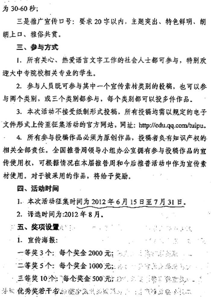 为做好第15届推普周宣传工作,全国推普周领导小组办公室决定开展一次推普周宣传素材征集活动。现将《全国推普周领导小组办公室关于向社会公开征集推普宣传素材的通知》(教语用司函〔2012〕30号)转发给你们,本次宣传素材创作以 “大力推广和规范使用国家通用语言文字”为主题,拟征集宣传海报、公益视频广告和推广宣传口号三类宣传素材,征集时间为6月15日至7月31日,所有投稿均需以规定的电子文件形式上传至指定的官方网站(://edu.qq.com/tuipu)。各地和学校要将征集活动作为开展第15届推普周宣传活动的一项重要内容,积极宣传,广泛发动广大关心、热爱语言文字工作的社会人士参与,尤其要动员、引导各高等学校和各省属中等职业学校的传媒、动画、美术等相关专业学生积极参与本次征集活动。