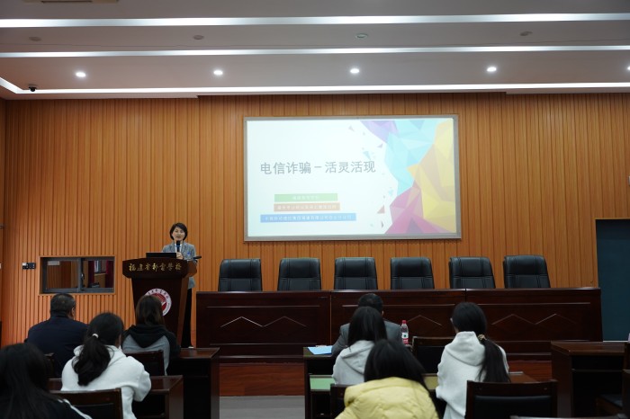 随后,陈主任作防范电信网络诈骗专题宣讲,从诈骗的概念入手,介绍高发类型与手段,重点剖析刷单返利、游戏账号充值、冒充熟人等常见陷阱,并提出针对性防范措施,提醒同学们做到不轻信、不透露、不转账,遇可疑情况及时核实或报警。