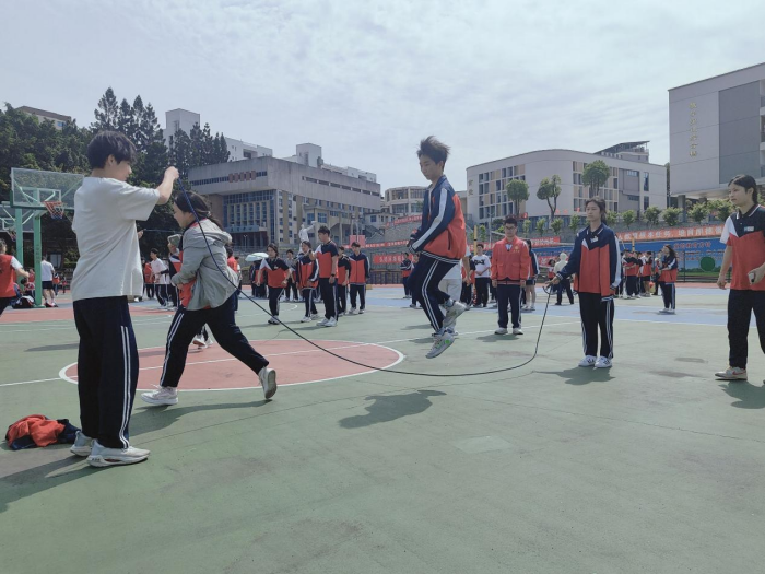 比赛中,各个班级精诚合作,争相在各个项目上发挥出最佳水平。班主任们不仅为同学们呐喊加油,还纷纷披挂上阵。绿茵场上阳光灿烂,欢笑不断。旱地龙舟在足球场上举行,哨声响起后,口号声、加油声、欢呼声此起彼伏,大家齐心协力,划着“龙舟”摇摇摆摆冲向终点,也奔向热烈的青春岁月。在足球九宫格项目上,选手们瞄准数字,摆开姿势,出脚那叫一个快准狠!足球破门而入的瞬间,激起场上的阵阵惊叹和欢呼。而在篮球场上,双人行和8字长绳项目也如火如荼地进行。不论是急转弯过杆,还是在挥动的长绳之中鱼贯而过,阳光为场上每位同学的脸庞都打上了一抹腮红。灵巧的动作,翻飞的长绳,激动的呐喊,加深了同窗情谊,也提高了团队凝聚力,将本次体育节的气氛推向高潮。